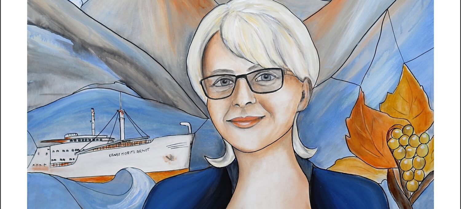 Classefrau Ilona Mende liebt den Weinanbau + die Berge + ihr Motorrad + die See und Seerederei. Einige Details habe ich auf ihrem Bild im Hintergrund malerisch dargestellt.